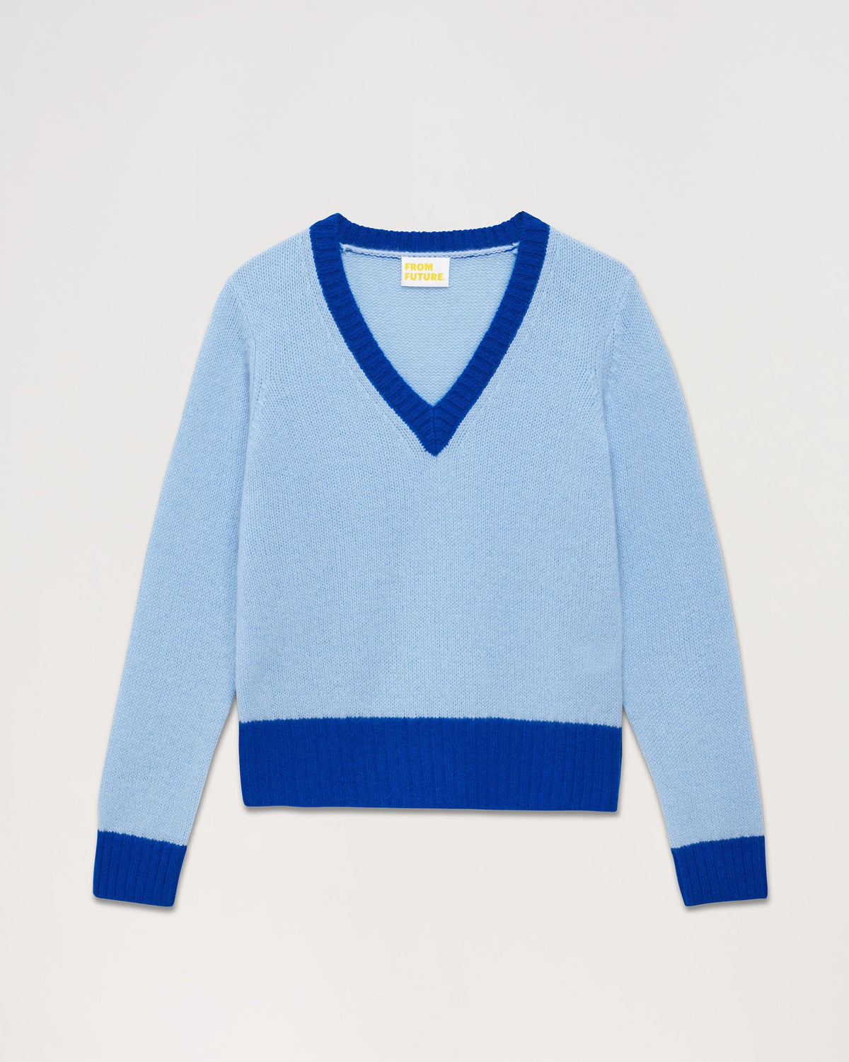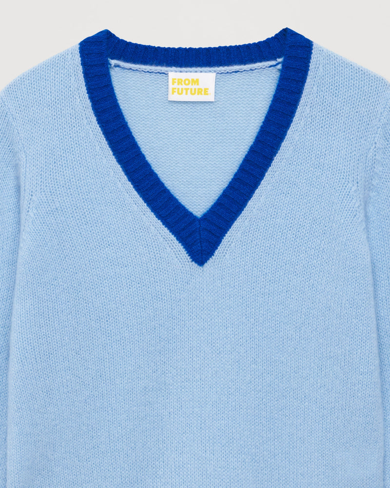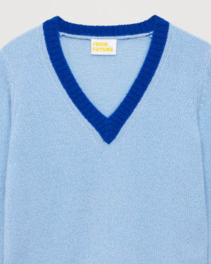 Sweater Pull Col V Bord-Cotes Contrastes Allege - Cachemire - Paradise blue